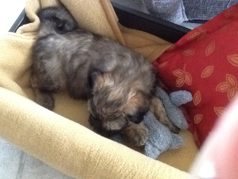 Auf der Fahrt nach Mosbach war ich sehr unruhig. Ich wechselte ständig den Schoß von Frauchen zu Katja und weinte, denn ich vermisste meine Mama und Geschwisterchen. In der neuen Umgebung angekommen schlief ich erst mal ganz fest ein.